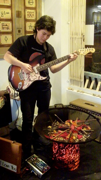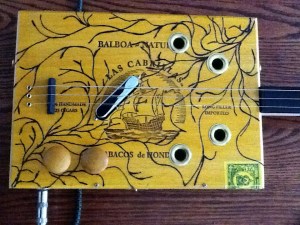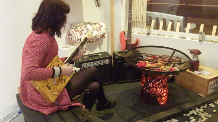The Hobo Symbol Installation showcased a handmade cigar box guitar being played in the “campsite” area, along with re-creations of hobo art such as the “notched art box” and the Hobo Symbols painting that depicts marks used by hobo travelers.