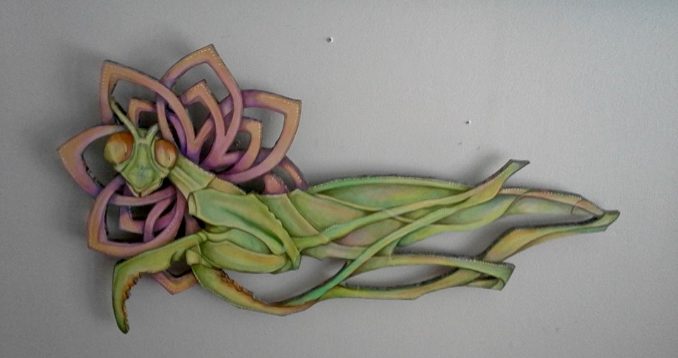 I wish I had better pictures of this – It was a client-initiated project to: Create a woodcut art piece that was some sort of combination of a praying mantis and a lotus flower. Here was the result.